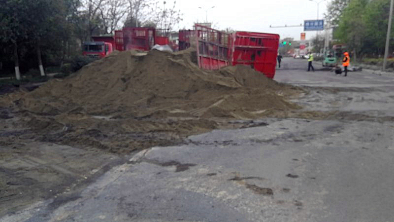 4月12日早上7:20,綿江路K282+100西科大門口,兩輛滿載砂石的運輸貨車,在江油至綿陽方向行駛的過程中,因變道發(fā)生撞車事故。事故現(xiàn)場砂石嚴(yán)重傾覆路面,其中一輛運輸貨車冒起白煙,情況十分嚴(yán)峻。