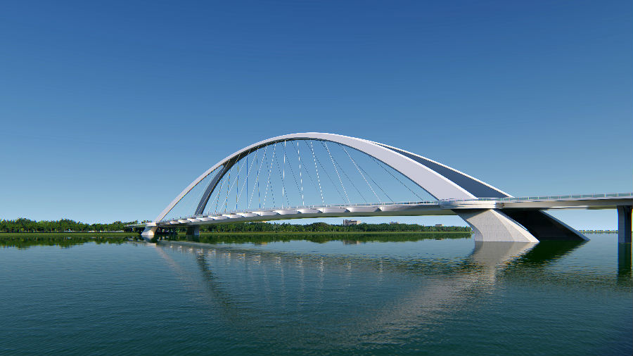 “撫音悅迎八方客,砥礪奮進(jìn)謀新篇”,寓意綿陽(yáng)科技城在現(xiàn)代化建設(shè)歷程中,以開(kāi)放、包容的姿態(tài)不斷迎接著新事物,開(kāi)拓創(chuàng)新,與時(shí)代接軌互聯(lián)?!皳崆僮V韻”為主跨243m提籃拱,主拱猶如張開(kāi)的風(fēng)琴般奏出美妙的音樂(lè),簡(jiǎn)約唯美。兩翼出挑的人行道猶如張開(kāi)的雙臂,豐富行人感官體驗(yàn),與主拱共同譜寫(xiě)出一曲浪漫的現(xiàn)代樂(lè)章,全橋視覺(jué)通透性好,有著強(qiáng)烈的韻律感。
