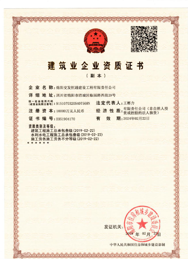 近日,經(jīng)綿陽市住房和城鄉(xiāng)建設(shè)委員會審核批準(zhǔn),恒通建工成功取得建筑工程施工總承包、水利水電施工總承包叁級、施工勞務(wù)施工勞務(wù)不分等級三個資質(zhì),標(biāo)志著公司順利拿到建筑工程、水利水電、施工勞務(wù)市場“入場券”。