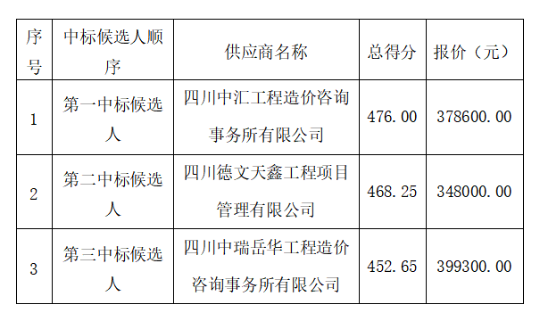 我公司委托四川久安工程管理有限公司代理招標(biāo)的“省道205線綿陽繞城段改線建設(shè)工程(游仙區(qū)段)項目結(jié)算復(fù)核審計服務(wù)”項目(項目編號:四川久安招[2021]7號)于2021年08月19日13時30分(北京時間)進(jìn)行公開招標(biāo),現(xiàn)對評審結(jié)果公示如下: ?