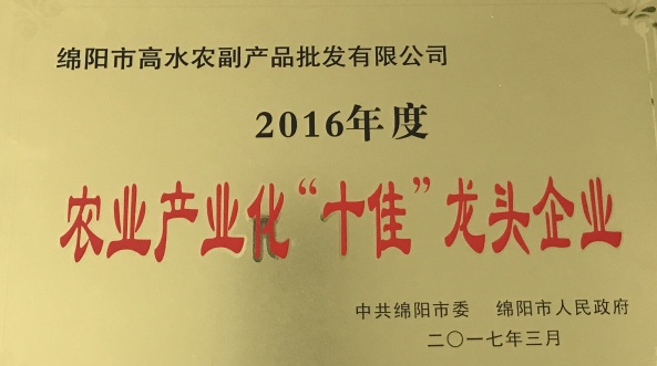 綿陽市高水農(nóng)副產(chǎn)品批發(fā)有限公司榮獲2016年度全市農(nóng)業(yè)產(chǎn)業(yè)化“十佳”龍頭企業(yè)