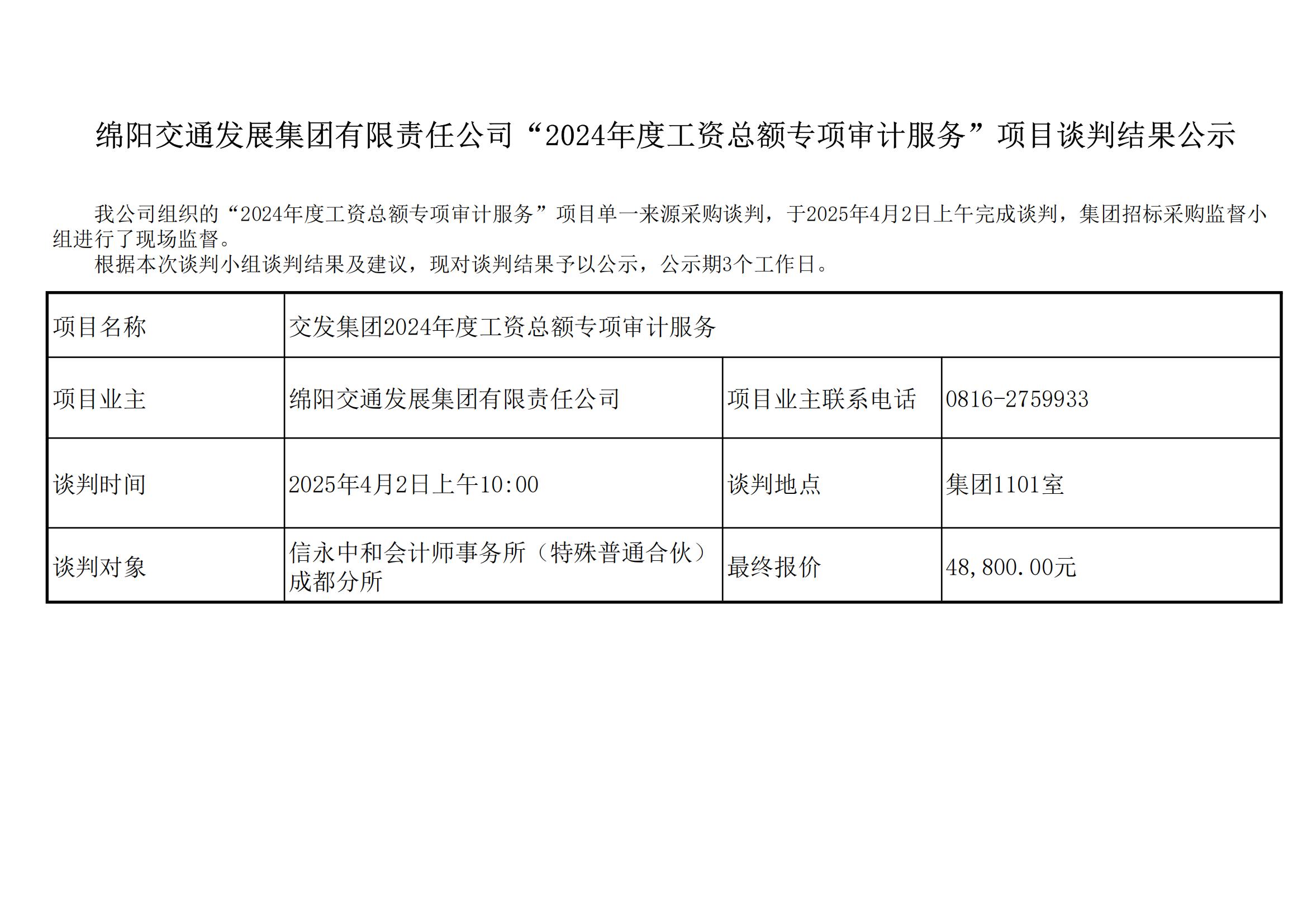 綿陽交通發(fā)展集團(tuán)有限責(zé)任公司“2024年度工資總額專項審計服務(wù)”項目談判結(jié)果公示