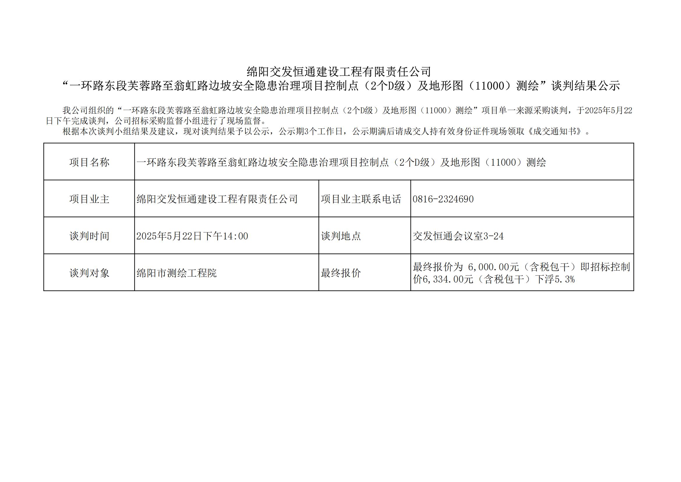 綿陽交發(fā)恒通建設(shè)工程有限責(zé)任公司一環(huán)路東段芙蓉路至翁虹路邊坡安全隱患治理項目控制點(2個D級)及地形圖(11000)測繪談判結(jié)果公示