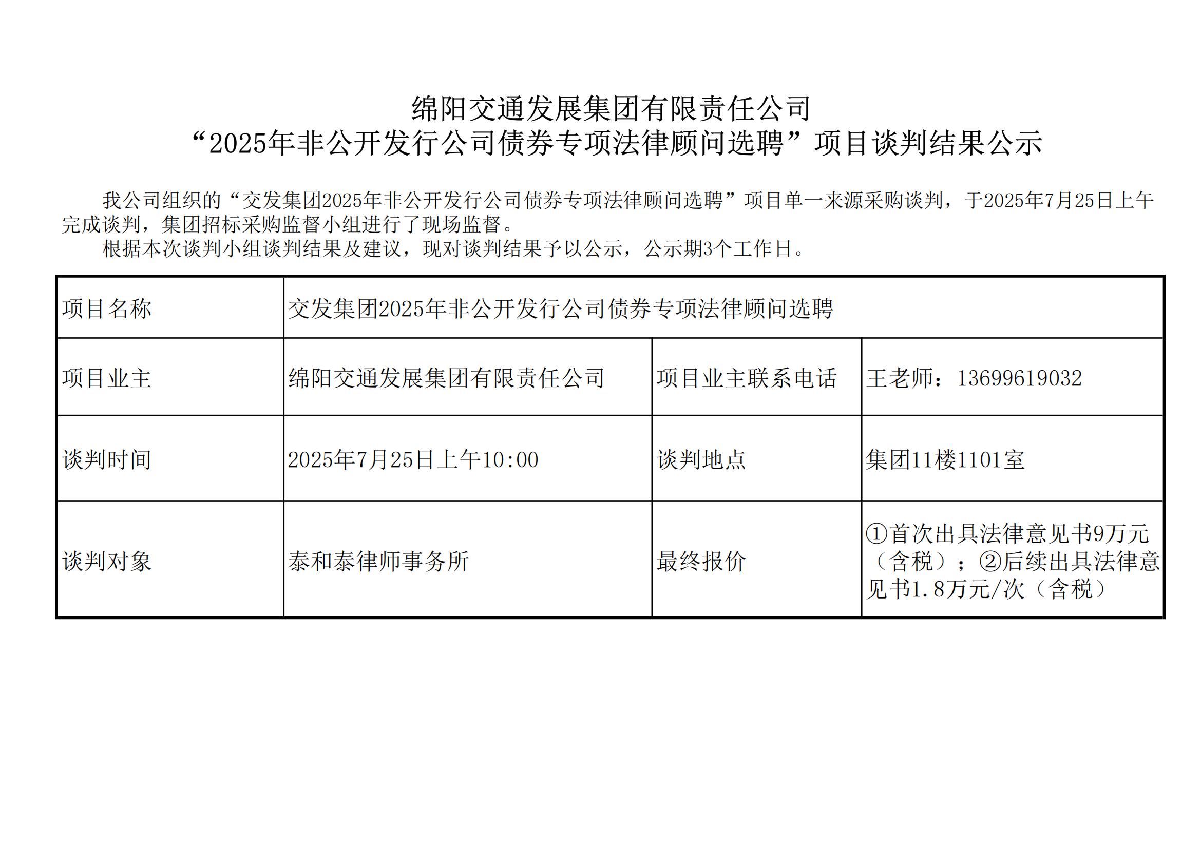 綿陽交通發(fā)展集團有限責任公司2025年非公開發(fā)行公司債券專項法律顧問選聘項目談判結(jié)果公示