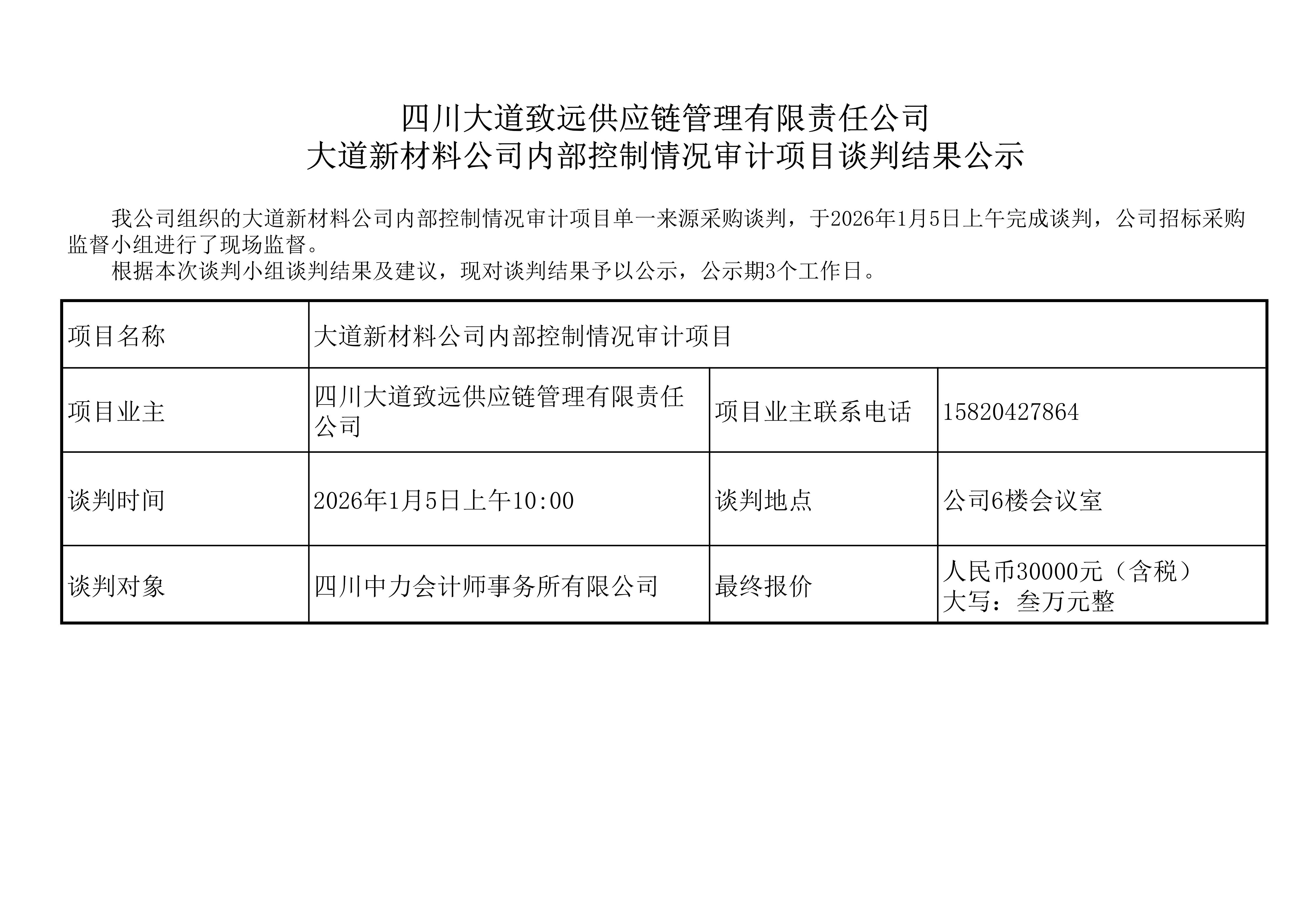 四川大道致遠(yuǎn)供應(yīng)鏈管理有限責(zé)任公司 大道新材料公司內(nèi)部控制情況審計項目談判結(jié)果公示