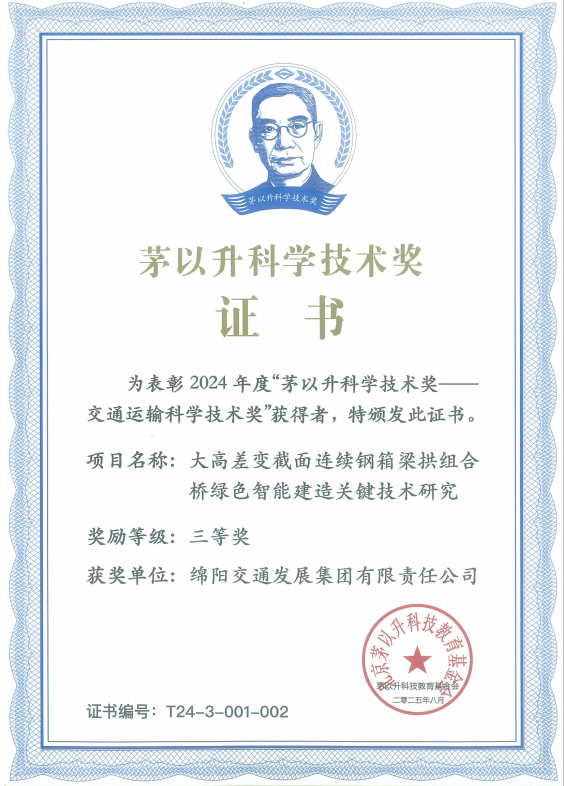 近日,北京茅以升科技教育基金會正式公布2024年度“茅以升科學(xué)技術(shù)獎”評選結(jié)果,由交發(fā)集團綿陽市青石路涪江大橋項目團隊研發(fā)的《大高差變截面連續(xù)鋼箱梁拱組合橋綠色智能建造關(guān)鍵技術(shù)研究》成果,憑借在橋梁建造領(lǐng)域的重大技術(shù)突破與實踐價值,榮獲茅以升科學(xué)技術(shù)三等獎,這是該項目在技術(shù)創(chuàng)新領(lǐng)域斬獲的重要國家級榮譽,彰顯了我國橋梁建造從“中國建造”向“中國智造”轉(zhuǎn)型的堅實步伐。