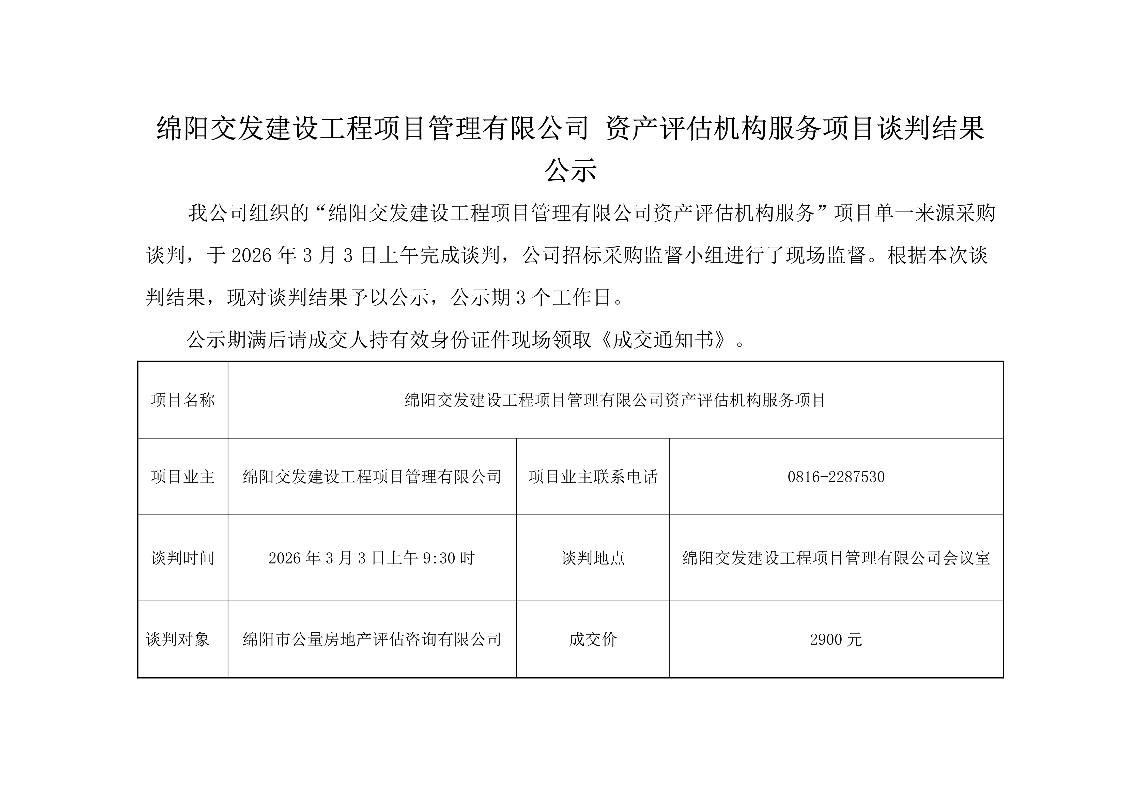 綿陽交發(fā)建設(shè)工程項目管理有限公司 資產(chǎn)評估機構(gòu)服務(wù)項目談判結(jié)果公示