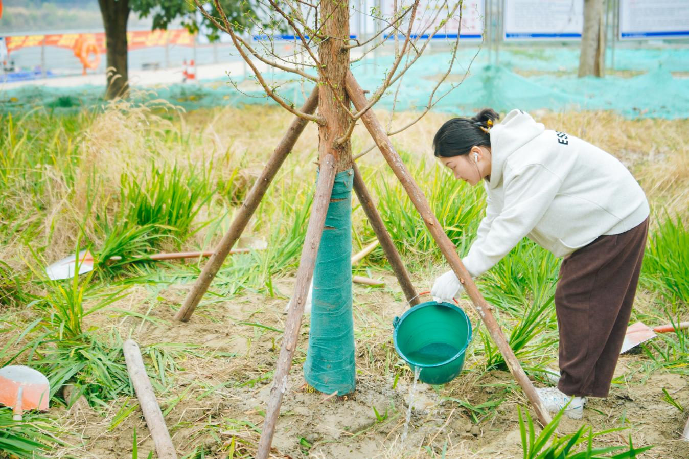 活動當天,涪江沿岸的植樹點一片熱火朝天,交發(fā)青年們手持鐵鍬、水桶等工具,迅速分組投入“戰(zhàn)斗”,揮鍬挖坑、扶苗正干、培土踩實、提水澆灌,每一個步驟大家都做得一絲不茍,腳下沾著泥濘,額頭滲著汗水,卻沒有一人喊累,一株株樹苗迎風挺立,為項目現(xiàn)場增添了一抹生機勃勃的綠意。