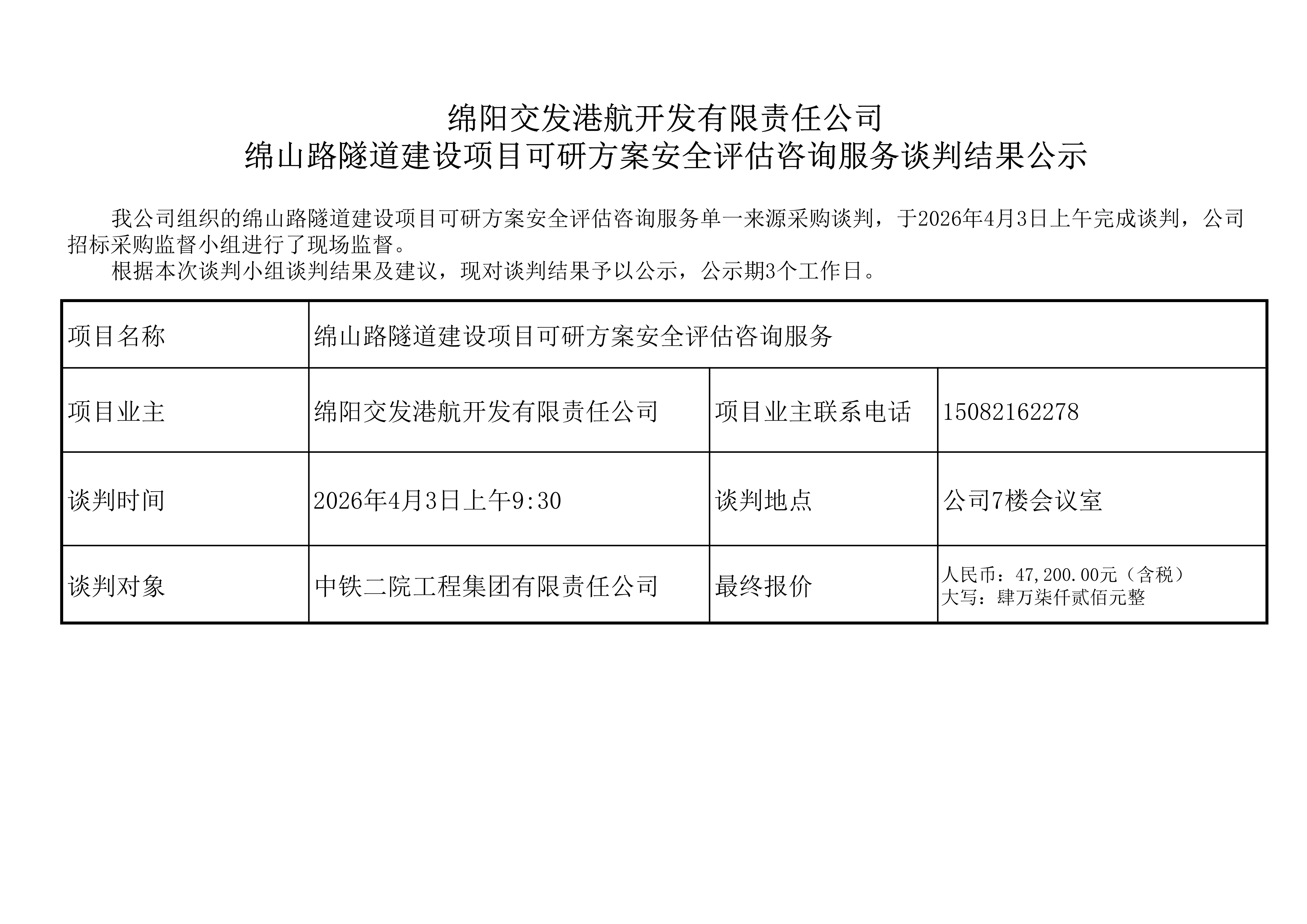 綿陽交發(fā)港航開發(fā)有限責任公司 綿山路隧道建設(shè)項目可研方案安全評估咨詢服務(wù)談判結(jié)果公示