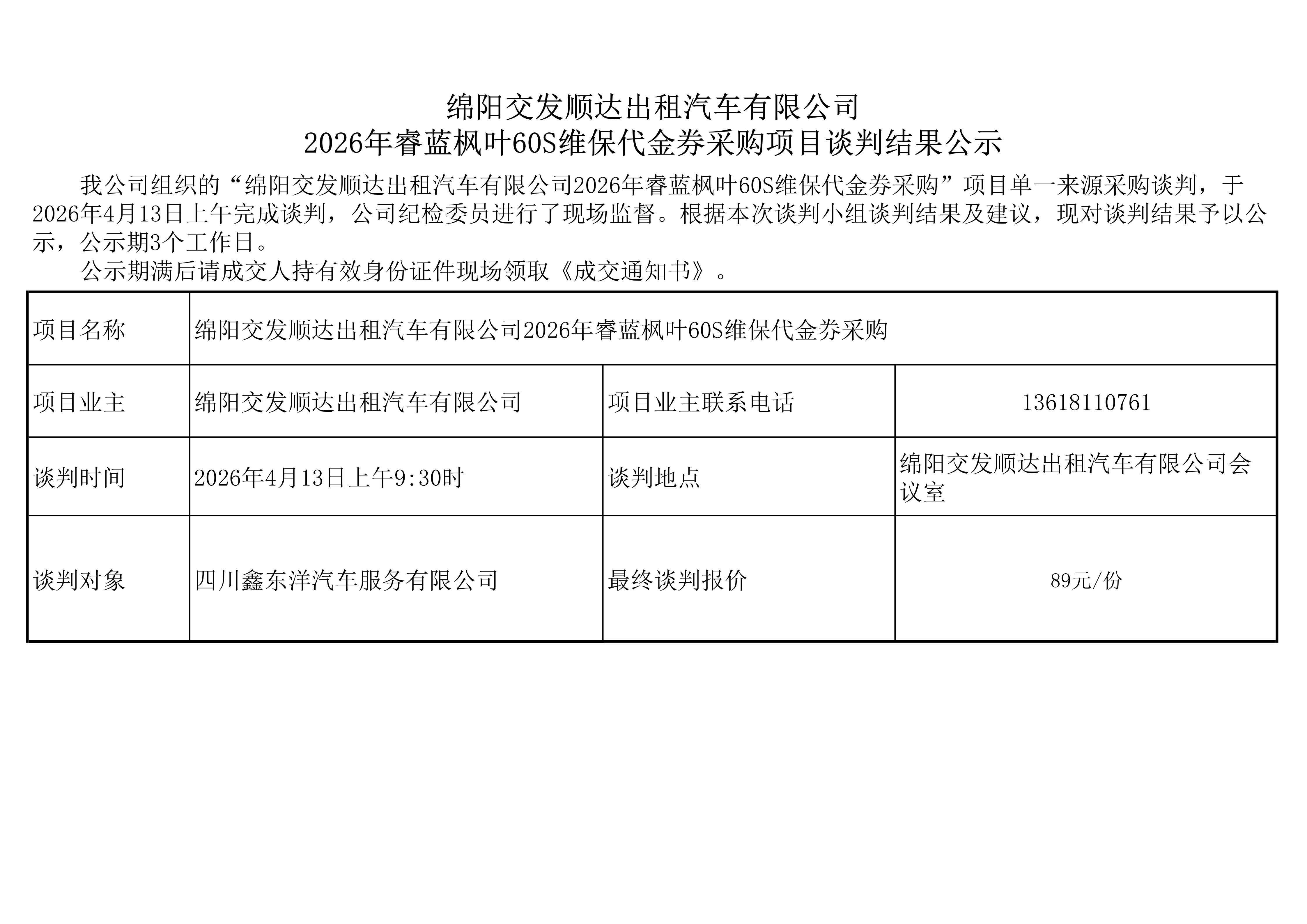 綿陽交發(fā)順達(dá)出租汽車有限公司 2026年睿藍(lán)楓葉60S維保代金券采購項(xiàng)目談判結(jié)果公示