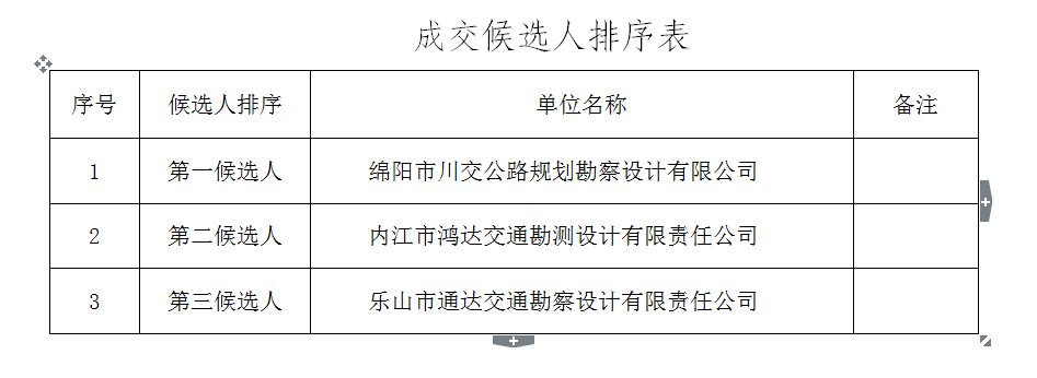綿陽交發(fā)恒通建設工程有限責任公司于2015年8月3日進行了?國道108線破廟子段路面病害處置工程設計?(項目編號:JFHT-2015-01)競爭性談判,經項目談判小組按競爭性談判文件既定程序進行競談,現(xiàn)將成交候選人公示如下: